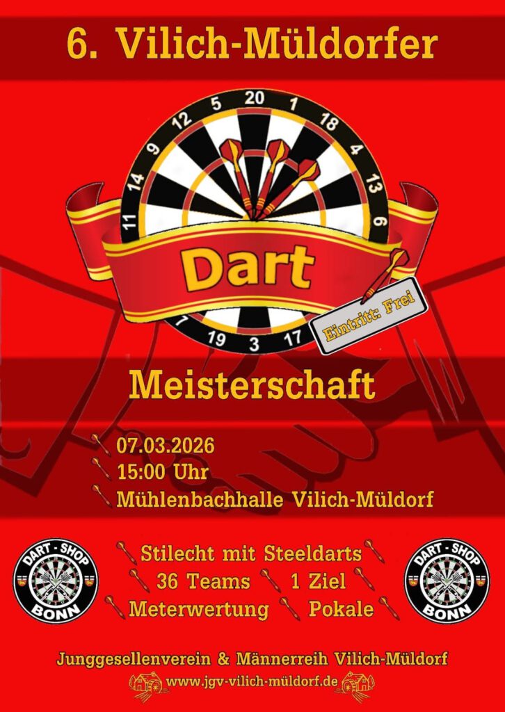 zum sechsten Mal lassen wir in Vilich-Müldorf die Pfeile fliegen. Somit findet am 07.03.2026 die sechste Vilich-Müldorfer Dartmeisterschaft statt.